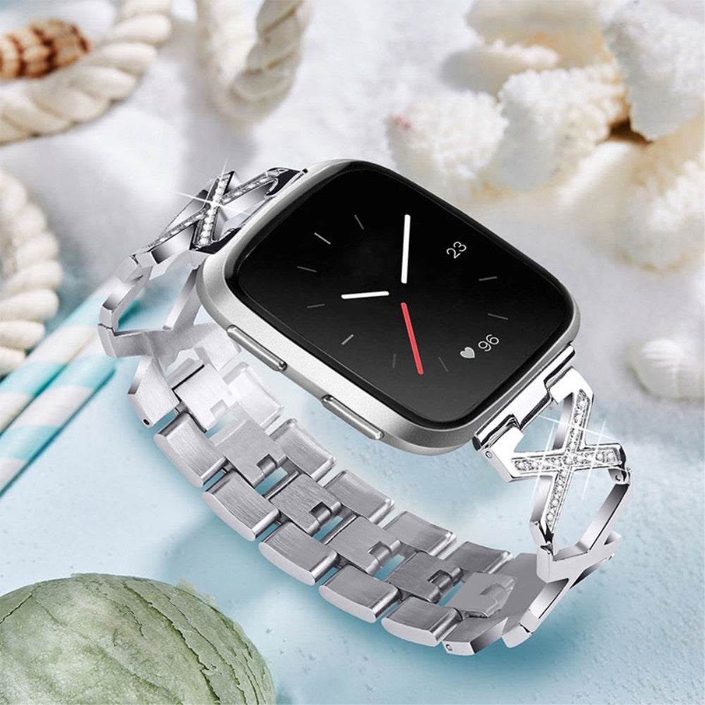 This premium stainless steel watchband instantly elevates your Fitbit Versa, combining a sleek X design with sparkling rhinestone accents for a truly glamorous look. Crafted from durable stainless steel, this strap is as resilient as it is stylish.