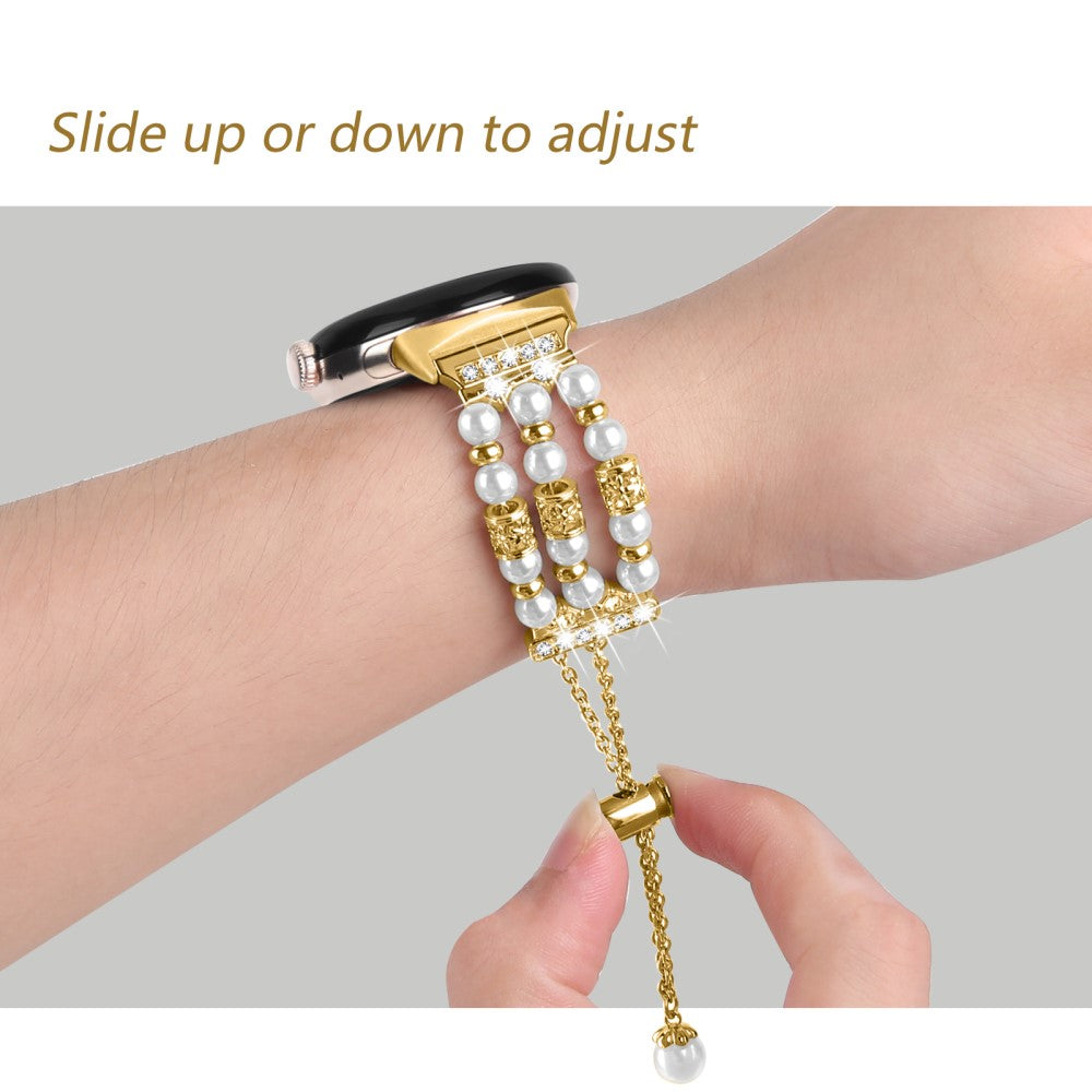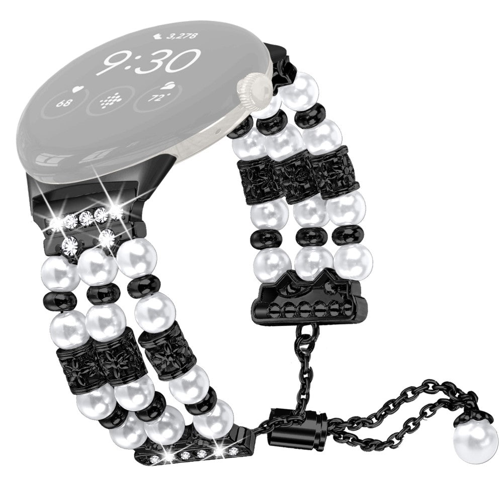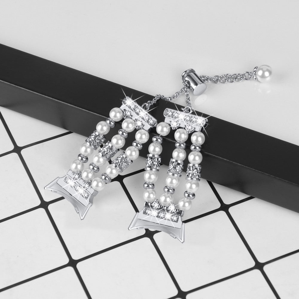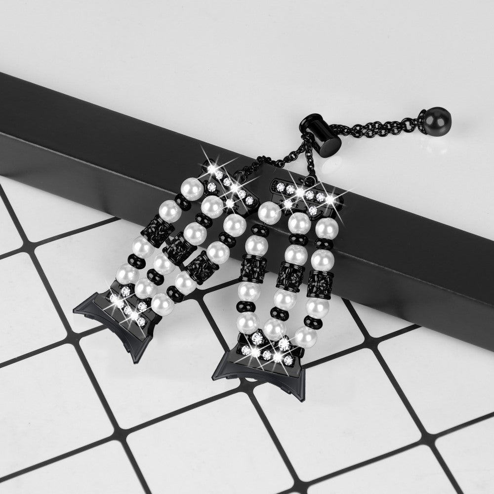 This watch band is made of premium bead and faux pearl materials, ensuring durability and elegance. Its detailed workmanship gives it a luxurious look, making it a visually stunning accessory. Designed to fit snugly around the wrist, it is easy to wear and adjust, making it a great alternative strap for your smart wristband.